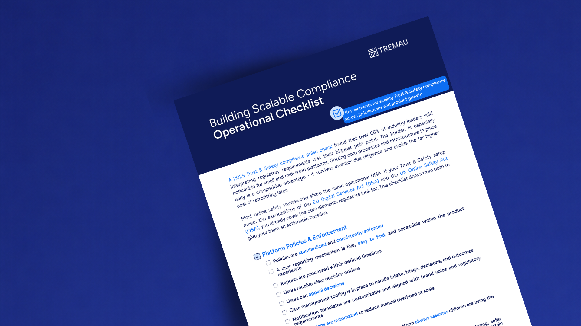 If compliance today feels reactive, fragmented, and hard to sustain across teams, products, and jurisdictions, this checklist is a good place to start. It helps you assess whether the core operational foundations are in place: platform policies and enforcement consistency, reporting and appeals workflows, risk assessments, governance structures, child safety safeguards, and transparency reporting. Built around the shared baseline of the DSA and UK OSA, it gives your team a practical framework to identify gaps early and build a compliance operation that can scale with product growth and regulatory change.